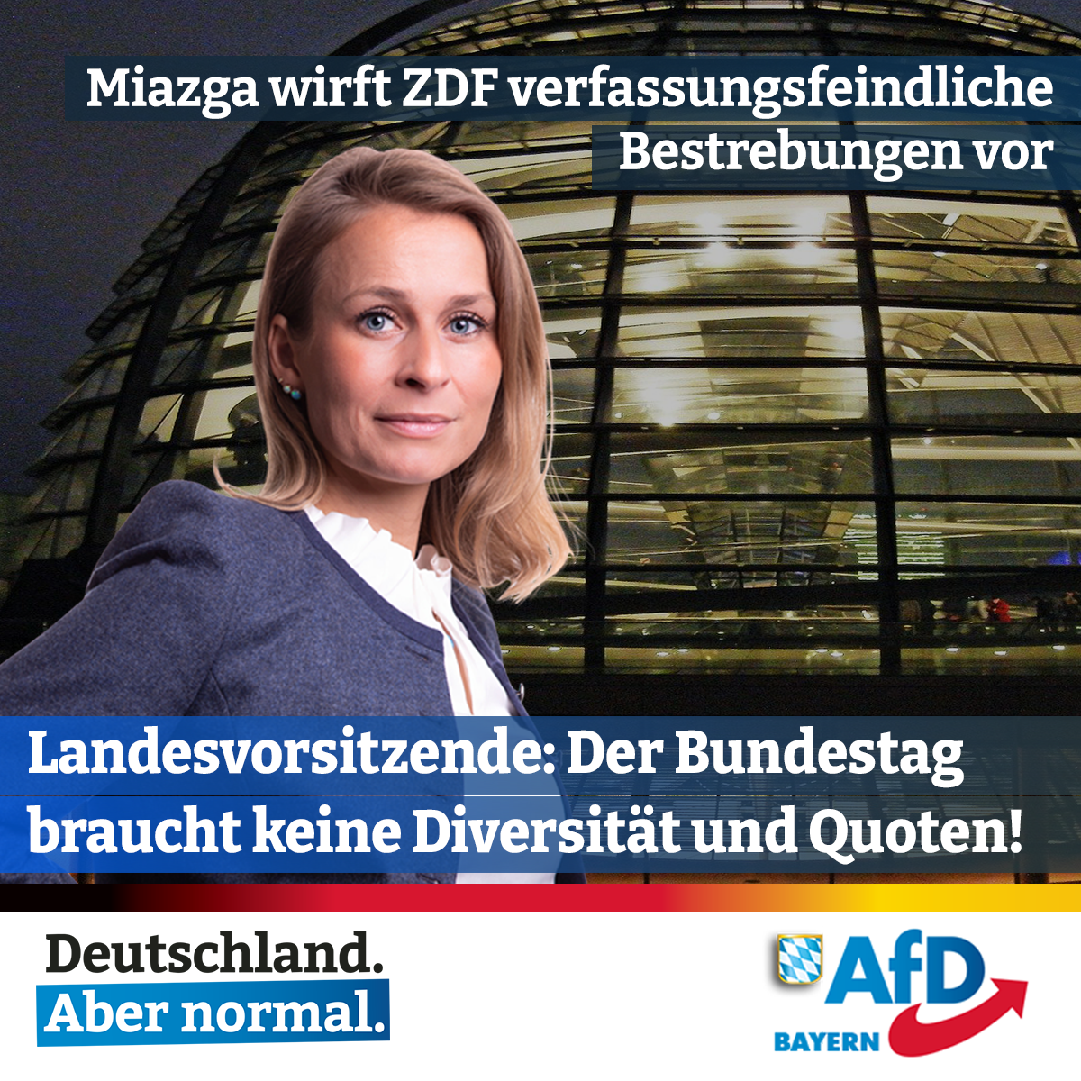 Landesvorsitzende: Der Bundestag braucht keine Quoten MÜNCHEN. Die bayerische AfD-Landesvorsitzende Corinna Miazga hat dem ZDF vorgeworfen, die parlamentarische Demokratie und die Idee des Staatsvolks abschaffen zu wollen. Zuvor hatte das […]