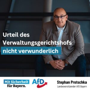 Protschka: AfD Bayern nimmt Urteil des Verwaltungsgerichtshofs gelassen zur Kenntnis Der bayerische Verwaltungsgerichtshof lehnte einen Eilantrag der AfD Bayern gegen ...