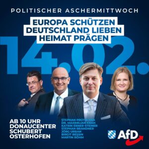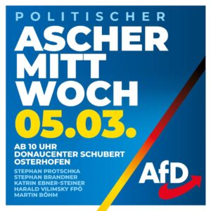 Politischer Aschermittwoch der AfD 2025 Im „Donaucenter Schubert“ Straße: Donau-Gewerbepark 24 Ort: 94486 Osterhofen (Niederbayern bei Deggendorf) Dabei sind: • ...