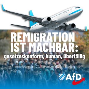 Am 23. November 2024 beschlossen über 500 Mitglieder des Landesverbands Bayern die Verabschiedung einer "Bayerischen Resolution für Remigration" (siehe https://afdbayern.devalternita.de/resolutionen/) ...
