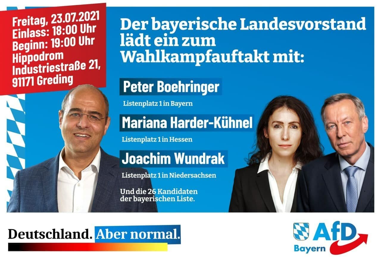 Am Freitag, dem 23. Juli, werden im Gredinger Hippodrom die Bundestagskandidaten der AfD-Bayern, angeführt von Peter Boehringer, gemeinsam mit den AfD-Spitzenkandidaten Marianna Harder-Kühnel (Hessen) und Joachim Wundrak (Niedersachsen) den Wahlkampf für die kommende Bundestagswahl eröffnen.